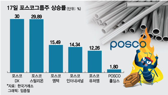 17일 포스코DX(30,500원 ▲350 +1.16%)는 전 거래일 보다 3600원(30%) 오른 1만5600원으로 거래를 마쳤다. 포스코DX와 함께 포스코스틸리온(47,700원 ▲1,700 +3.7%)도 상한가(29.89%)를 기록하며 장을 마쳤다. 포스코엠텍(18,130원 ▲830 +4.8%)(15.49%), 포스코인터내셔널(85,100원 ▲5,600 +7.04%)(14.34%), 포스코퓨처엠(211,500원 ▼1,500 -0.7%)(12.26%), 포스코홀딩스(1.8%) 등도 상승 마감했다. 포스코퓨처엠은 장중 38만4500원까지 올라가며 52주 신고가를 경신했다.