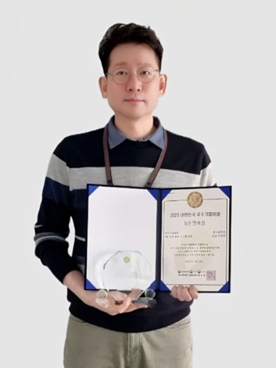 이경학 워프솔루션 대표가 머니투데이 주최의 '2023 제9회 대한민국 우수기업대상'에서 5년 연속상으로 '우수기술대상'을 비대면 수상하고 기념 촬영 중이다.
