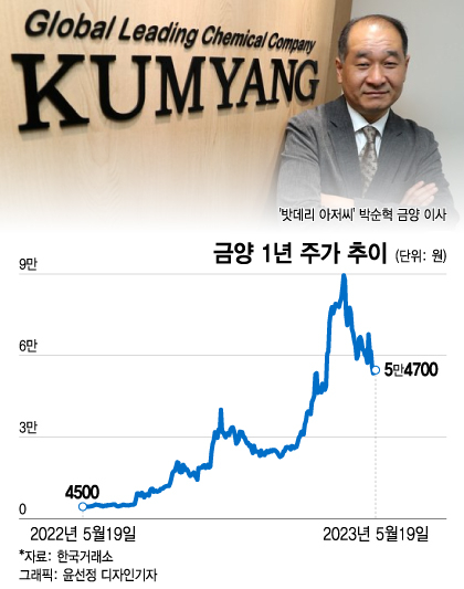 지난해 초 4000원대였던 금양 주가는 올해 4월 최고 9만2500원까지 오르며 20배가 넘는 수익률을 기록했다. 지난 19일 종가는 5만4700원으로 고점 대비 40%가량 조정받았지만 여전히 높은 수익률이다.
