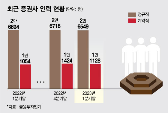 18일 금융투자협회에 따르면 올해 1분기 말 기준 증권사 60곳의 정규직원은 2만6549명, 계약직은 1만1128명으로 집계됐다. 이는 지난해 4분기 말(정규직 2만6718명, 계약직 1만1424명)보다 각각 169명, 296명 줄어든 것이다. 지난해 같은 기간(정규직 2만6694명, 계약직 1만1054명) 대비로 정규직은 145명 감소했고, 계약직은 74명 늘었다.