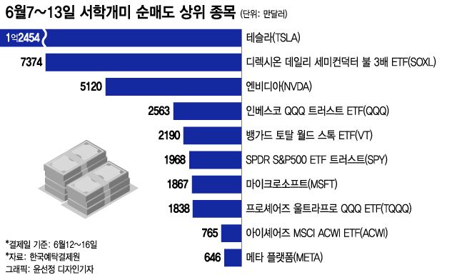 순매도 규모는 직전주(5월31일~6월6일)에 5000만달러대까지 줄었으나 테슬라와 엔비디아, 반도체주 랠리가 이어지면서 차익 매물이 늘어나 다시 2억달러대를 넘어섰다.