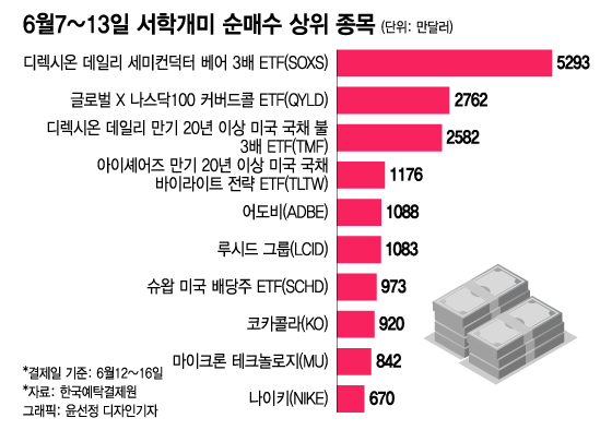 서학개미들은 이 기간 동안 SOXS를 가장 많은 5293만달러 순매수했다. 반도체주가 단기 급등한 만큼 조정이 불가피하다고 판단한 것이다.