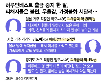 12일 하루인베스트 피해자들은 본지와의 인터뷰에서 지난 한 달간 불면, 우울감, 식욕감퇴, 가정불화 등에 시달렸다고 밝혔다. 피해자들이 구성한 '하루인베스트 정상화를 위한 대표단'에 따르면 전날 오후까지 국내 피해자는 650여명, 피해액은 1500억원이다. 해외 거주 피해자는 70명, 피해액은 4000만달러(약 516억원)에 이른다.