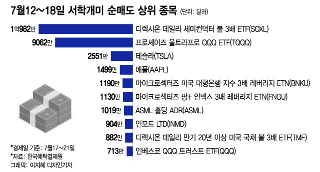 서학개미들은 이 기간 동안 ICE 반도체지수와 나스닥100지수의 하루 수익률을 3배 따르는 디렉시온 데일리 세미컨덕터 불 3배 ETF(SOXL)와 프로셰어즈 울트라프로 QQQ ETF(TQQQ)를 각각 1억982만달러와 9062만달러 순매도했다.