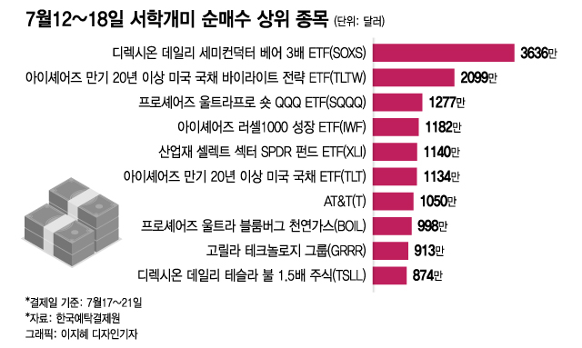 반면 서학개미들은 이 기간에 ICE 반도체지수와 나스닥100지수의 하루 수익률을 반대로 3배 추종하는 디렉시온 데일리 세미컨덕터 베어 3배 ETF(SOXS)와 프로셰어즈 울트라프로 숏 QQQ ETF(SQQQ)는 3636만달러와 1277만달러 순매수했다.