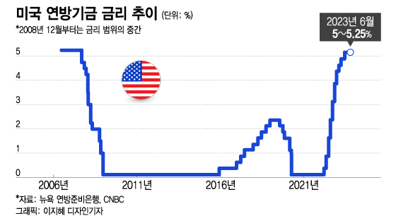 연준은 지난해 3월부터 10번 연속 금리를 인상한 뒤 지난 6월에는 금리를 5~5.25%로 동결했다. 이번에 금리가 5.25~5.5%로 올라가면 2001년 1월 이후 22년만에 최고 금리가 된다.