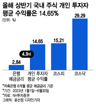 29일 본지가 NH투자증권에 의뢰해 개인투자자 261만명(1634만계좌)의 올해 상반기 투자 현황 및 성과를 분석한 결과 국내 주식 평균 수익률은 14.65%로 집계됐다. 일본 닛케이 상승률을 제친 코스닥 상승률(29.29%)엔 못 미치지만 코스피 상승률(15.21%)과 비슷한 정도다. 지난달 30일 기준 저축은행 6개월 평균 예금금리(2.84%)와 비교하면 4.9배에 이른다.