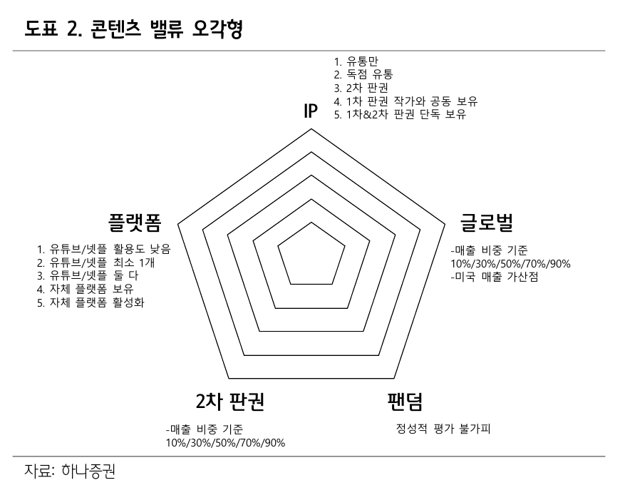 콘텐츠 기업가치 평가를 위한 지식재산권(IP) 보유 여부, 글로벌 매출 비증, 팬덤의 깊이, 2차 판권 매출 비중, 플랫폼 활용도 등으로 구성된 '오각형 모델'을 제시했다.