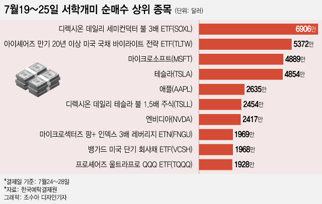 이 기간 동안 가장 많이 순매수된 종목은 ICE 반도체지수의 하루 수익률을 3배 추종하는 디렉시온 데일리 세미컨덕터 불 3배 ETF(SOXL)로 6906만달러의 매수 우위를 나타냈다.