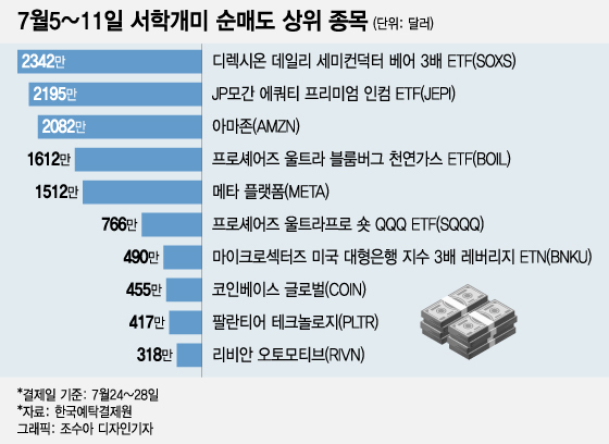 올 상반기에 랠리의 지속성을 믿지 못하던 서학개미들이 대안으로 투자하던 월배당 상품인 JP모간 에쿼티 프리미엄 인컴 ETF(JEPI)는 기술주의 장기 상승세 속에 상대적인 수익률 부진이 두드러지며 2195만달러 매도 우위를 나타냈다.