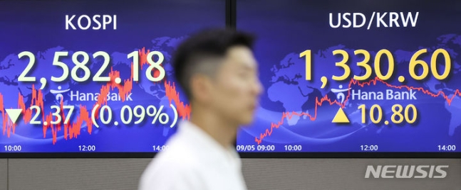 5일 코스피는 전 거래일 대비 2.37포인트(0.09%) 내린 2582.18을 나타냈다. 오후 3시58분 기준 개인과 기관이 각각 304억원, 1469억원 순매도했고 외국인이 1485억원 순매수했다.