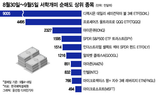 서학개미들이 지난 8월30일~9월5일 사이에 가장 많이 순매도한 종목은 ICE 반도체지수의 하루 수익률을 3배 추종하는 디렉시온 데일리 세미컨덕터 불 3배 ETF(SOXL)이다.