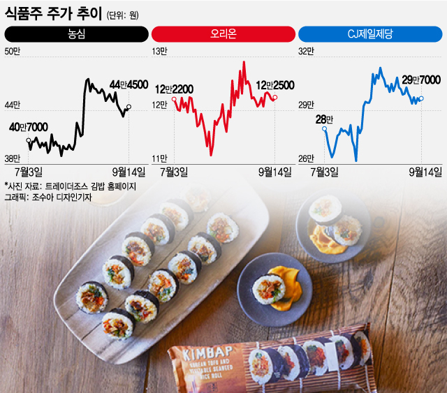 외국인들의 식품주 사랑은 K-푸드 인기 덕분이다. 최근 미국 전역에 564개 매장을 둔 트레이더 조스에서 출시한 냉동 김밥이 품절 대란 사태를 겪었다. 트레이더 조스뿐 아니라 H마트, 세이위(SayWeee) 등 아시안 식품점에서도 냉동 김밥 구매가 어려운 상황이다.
