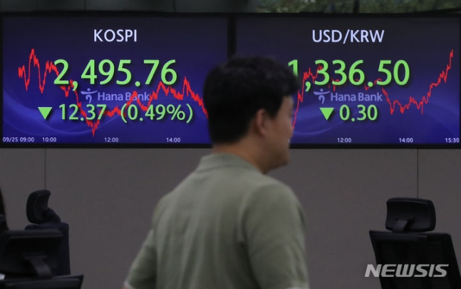 25일 증시에서 코스피는 전 거래일 대비 12.37포인트(0.49%) 내린 2495.76에 거래를 마쳤다. 장중 2486.44까지 떨어졌으나 장 마감 직전 낙폭을 줄였다. 오후 4시10분 기준 개인과 기관은 각각 480억원, 708억원 순매수했지만 외국인은 1339억원 순매도했다.