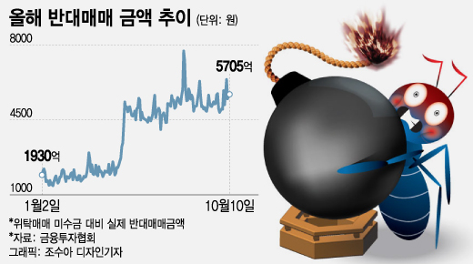반대매매 규모는 점차 증가하다가 올 하반기 들어 일평균 500억원을 넘어섰다. 하반기 일평균 반대매매 금액은 △7월 546억원 △8월 541억원 △9월 530억원 △10월 582억원이다. 이 기간 코스피지수는 2600선에서 2450선으로, 코스닥지수는 880선에서 810선으로 떨어졌다. 분기별로 보면 올 3분기 반대매매 규모는 일평균 531억원이었고 반대매매 통계를 집계한 2006년 2분기 이후 가장 많았다.