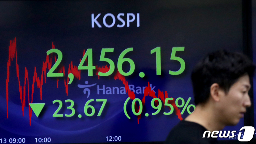 13일 코스피 지수는 전 거래일보다 23.67포인트(0.95%) 내린 2456.15를 기록했다. 외국인과 기관 투자자가 각각 1613억원, 2830억원씩 팔아치우며 지수를 끌어내렸다. 개인이 나 홀로 4224억원 순매수하며 방어에 나섰지만, 지수 지키기에는 실패했다.