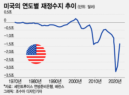 문제는 오히려 미국의 재정적자다. 지난 9월말로 마감된 회계연도 2023년도에 미국의 재정적자 규모는 2조달러를 넘어섰다.