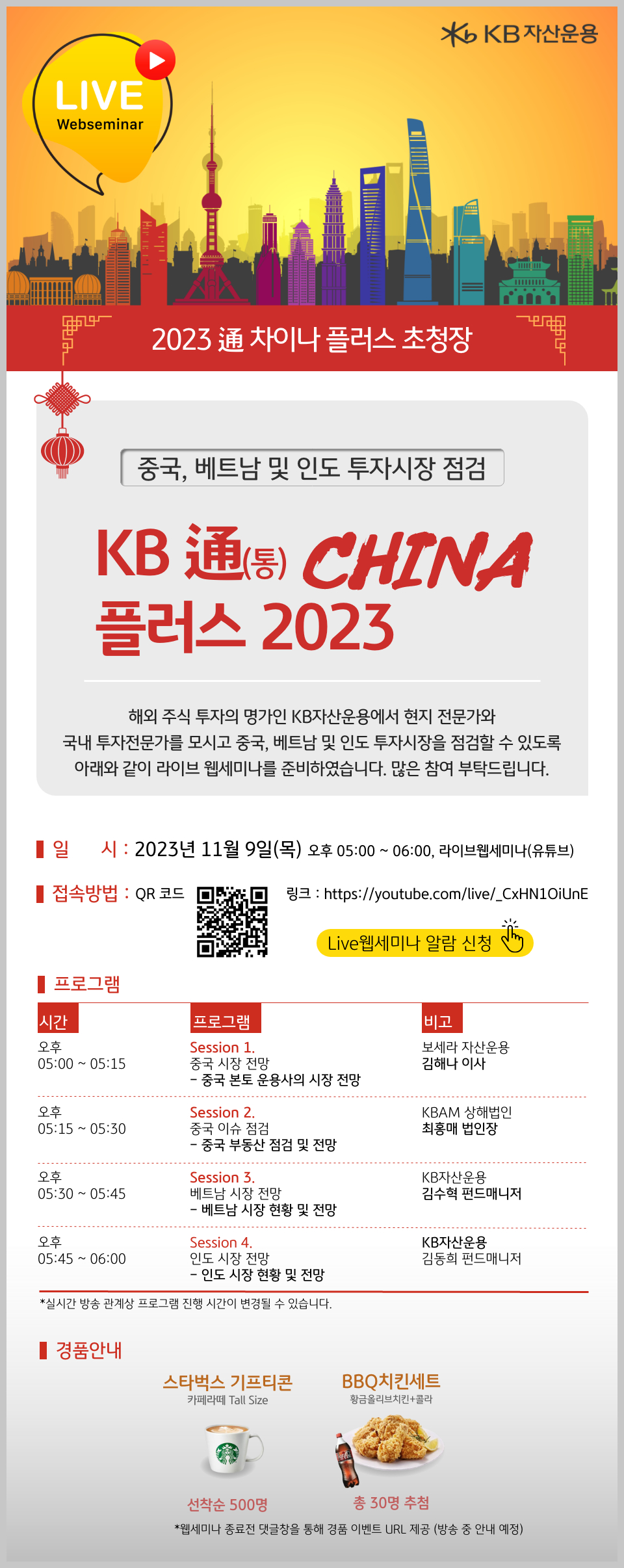 중국 현지 운용사인 보세라자산운용 김해나 이사의 '중국 본토 운용사의 시장 전망'을 시작으로, '중국 이슈 점검' 세션에선 최홍매 KB자산운용 상해법인장이 중국 부동산 시장을 점검하고 전망을 발표한다.