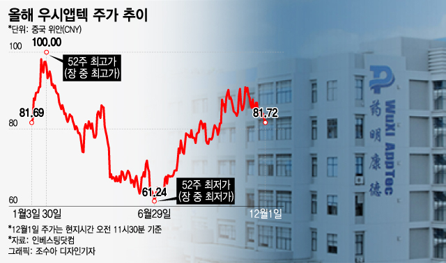 1일 상하이 증권거래소에서 우시앱텍은 전일 대비 0.48% 오른 83위안에 거래를 마쳤다. 대폭 내렸던 주가는 연말에 이르러서야 연초 수준을 회복했다. 올해 들어 상하이종합지수가 2.72%, 선전종합지수가 12.56% 내린 것을 고려하면 우시앱텍의 주가 흐름은 상대적으로 양호하다.