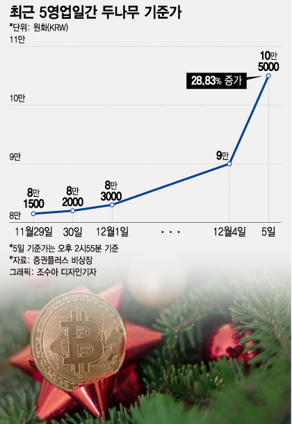 비상장주식 거래 플랫폼 증권플러스 비상장에 따르면 같은 시간 기준으로 두나무의 기준가는 전일 대비 16.67% 오른 10만5000원이다. 지난달 29일 1.24%, 30일 0.61%, 지난 1일 1.22%, 4일 8.43% 오르면서 5거래일째 강세다. 기준가는 한 달 전(지난달 6일)과 비교해 40.93% 올랐다.