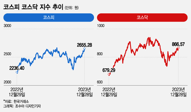 코스닥 지수의 흐름도 크게 다르지 않았다. 올해 초 660.32를 기록했던 코스닥은 상반기 이차전지 관련주들의 급등 랠리에 지난 7월 26일 장중 956.40까지 치솟았지만, 우하향을 지속해 730선에 닿았다. 11월 이후 반등 흐름을 탔고 이날 860선을 회복했다.