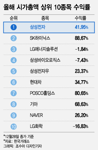 연말에는 반도체주가 상승 흐름을 보이며 주도주로 자리를 굳혔다. 반도체 빅2 삼성전자와 SK하이닉스를 필두로 랠리가 이어졌다. 반도체 업황 개선과 AI(인공지능) 모멘텀에 대한 기대감에 따라 수급이 쏠린 영향으로 풀이된다. 한미반도체(260,000원 ▲4,000 +1.56%)는 418.49% 뛰었다.