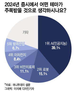 올해 증시에서 어떤 테마가 주목받을 것으로 예상하냐는 설문에서는 AI(인공지능) 테마가 39.1% 득표해 1위를 차지했다. 로봇 업종의 강세를 예측하는 의견도 15.1%에 달했다. 그 뒤를 비만치료제(11.1%), 이차전지(8.4%), 방위산업(6.7%) 테마가 이었다.