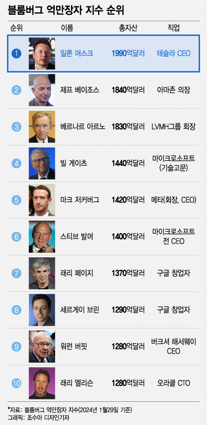 이어 △3위 베르나르 아르노 루이비통모에헤네시(LVMH) 그룹 회장(1830억달러) △4위 빌 게이츠 마이크로소프트 기술고문(1440억달러) △5위 마크 저커버그 메타 회장(1420억달러) 순이다.