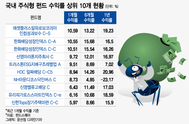 8일 펀드스퀘어에 따르면 최근 1달간 국내 주식형 펀드 수익률 상위권엔 고배당 지주사를 편입하고 있는 펀드가 많았다. 수익률 1위는 '에셋플러스알파로보코리아인컴성과보수 C-S(에셋플러스알파로보 펀드)'로 10.59%의 성과를 냈다.
