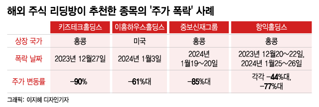 국내 투자자가 많이 매수한 중화권 주식이 폭락하는 일이 이어진다. 유명인을 사칭하는 해외 주식 리딩방에서 추천하는 종목이다. 국내에도 현지에도 잘 알려지지 않은 시가총액이 작은 종목이 주로 먹잇감이 된다. 일부 투자자들은 주가 폭락 이후에도 별다른 피해 복구 방법이 없다며 매수를 이어간다.
