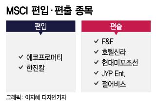 이번 정기 변경에서 편출 종목은 △F&F △호텔신라 △현대미포조선 △JYP Ent. △펄어비스 등 총 5개다. MSCI는 전체 시가총액과 유동 시가총액을 기준으로 지수 편입 종목을 선정하는데, 제외 종목 대부분이 최근 부진한 흐름을 보여왔다.