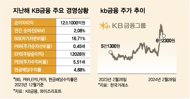 KB금융은 2023년 4분기 약 1조원의 대규모 일회성 비용이 발생했음에도 2023년 연간 연결 순이익이 4조6300억원으로 전년 대비 11.5% 증가했다.