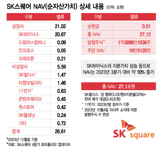 지난해 연결 기준 SK스퀘어의 잠정 매출액은 2조2765억원, 영업손실은 2조3397억원을 기록했는데도 긍정적 시각이 지배적인 건 최대주주로 있는 SK하이닉스 덕분이다. SK하이닉스도 지분법 평가손에 따라 적자 국면이 지속되고 있지만, 지난해 4분기 흑자 전환하는 등 개선 움직임이 나타나고 있다.