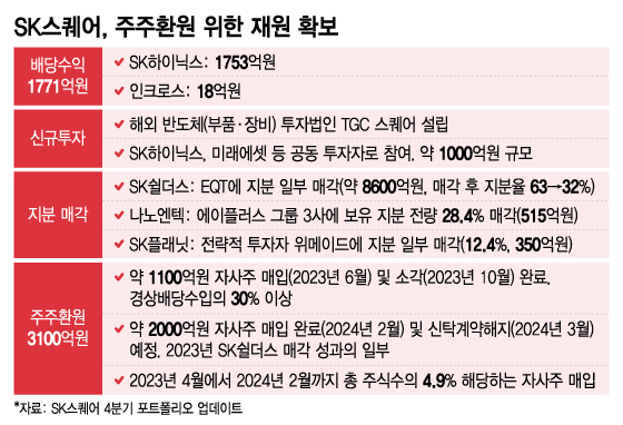 배당수익과 지분 매각을 통해 주주환원과 신규 투자를 위한 재원도 안정적으로 확보하고 있다. 지난해 배당수익은 1771억원으로, SK하이닉스의 배당수익(1753억원)이 대부분을 차지했다. 지분 매각 규모는 △SK쉴더스 약 8600억원(지분 일부 매각) △나노엔텍 515억원(지분 전량) △SK플래닛 350억원(지분 일부 매각) 등이다. SK스퀘어는 지난해 4월부터 올해 2월까지 총 주식수의 4.9%에 해당하는 자사주 매입했다고 밝혔다.