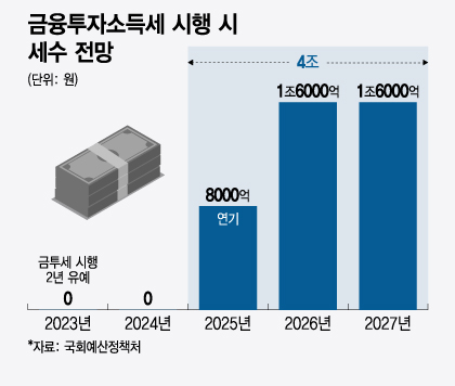 국회예산정책처가 양경숙 더불어민주당 의원실에 제출한 자료에 따르면 금투세 시행 후 2025년부터 2027년까지 약 4조328억원의 세수가 늘어난다. 개인 투자자 증권계좌에서 이만큼의 돈을 가져오겠다는 얘기다. 연평균 1조3443억원이다.