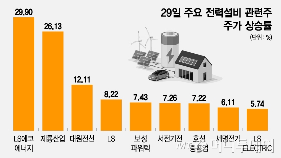 송·배전 자재 등을 생산하는 제룡산업(7,640원 ▲150 +2%)은 전 거래일에 25.99% 급등한데 이어 이날도 26.13% 상승 마감했다. 통신케이블 업체 대원전선(5,470원 ▲130 +2.43%)은 12.11% 상승했다. 이밖에 LS(293,500원 ▲13,500 +4.82%), 보성파워텍(9,750원 ▲70 +0.72%), 서전기전(5,330원 ▲150 +2.9%), 효성중공업(2,940,000원 ▲58,000 +2.01%), 세명전기(9,360원 ▲180 +1.96%), LS ELECTRIC(788,000원 0%) 전력설비 관련주들이 5~10%대 강세로 장을 마쳤다.