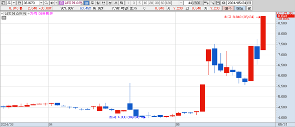 삼영에스앤씨(3,440원 ▲140 +4.24%)가 장중 급등을 보이고 있다.