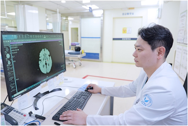 부평세림병원 응급의료센터장전병한 전문의가 인공지능 솔루션을 활용해 응급환자의 뇌졸중을 진단하고 있다.