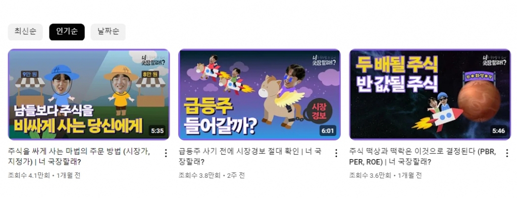 사내 유튜버를 통해 국내 투자에 유용한 정보를 쉽고 재미있게 전달해 국내 증시에 대한 인식을 개선하자는 취지에서 진행하는 콘텐츠다. 2~3주 주기로 콘텐츠를 제작해 국내 투자 장려라는 주제의식을 명확히 하면서 시청자들의 예측가능성과 일관성 제고 노력도 펼치고 있다.