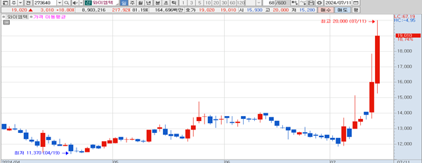 와이엠텍(11,270원 ▼390 -3.34%)이 급등하여 20% 이상까지 상승했다.