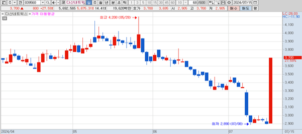 다산네트웍스(5,070원 ▲195 +4%)가 급등하여 26% 이상까지 상승했다.