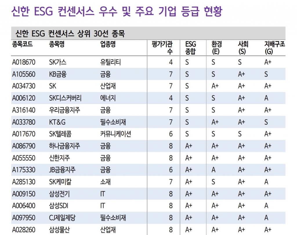 신한투자증권이 국내외 주요 ESG(환경·사회·지배구조) 평가기관들의 데이터 기반으로 국내 기업 300곳의 ESG 컨센서스(시장 평균 평가치)를 도출했다. SK가스와 KB금융 등 7곳이 가장 높은 S등급을 받았다. 업종별로는 유틸리티와 에너지, 금융이 최상위에 위치했다.