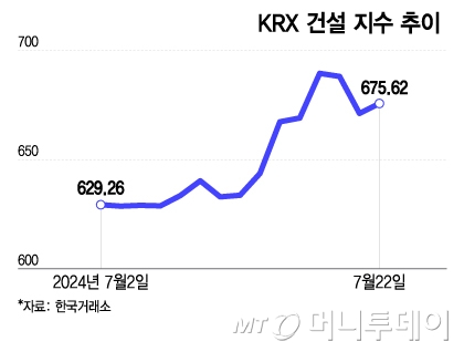 올해 상반기 건설주는 연일 우하향 흐름을 이어가다 이달 들어 오름세를 나타내고 있다. HDC현대산업개발(17%), GS건설(18%), 현대건설(2%), 대우건설(11%), DL이앤씨(5%) 등 2~18%대 상승률을 보인다. 건설업종을 담고 있는 KRX 건설 지수는 이달(7월1일~7월22일) 들어 4.95% 올랐다. 올해 상반기(1월2일~6월28일) 동안 4% 내리며 연일 부진한 흐름을 이어오다 하락 폭을 모두 만회한 셈이다.