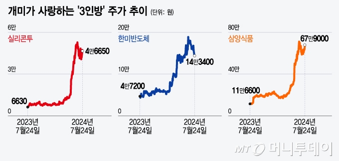 24일 증시에서 실리콘투(48,700원 ▲1,550 +3.29%)는 전 거래일 대비 750원(1.58%) 내린 4만6650원에 거래를 마쳤다. 한미반도체(295,000원 ▲8,000 +2.79%)는 2100원(1.44%) 내린 14만3400원에 삼양식품(1,359,000원 ▼18,000 -1.31%)은 2만원(3.03%) 오른 67만9000원에 거래를 마감했다. 최근 1년간 실리콘투 주가는 600% 올랐다. 한미반도체와 삼양식품도 각각 200%, 500%가량 오르며 엔비디아 부럽지 않은 수익률을 기록했다.