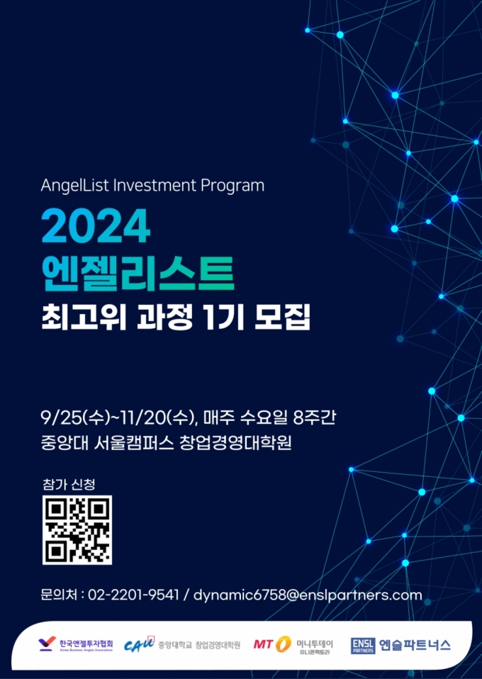 머니투데이 스타트업 전문 미디어 유니콘팩토리가 엔젤투자 활성화를 위해 한국엔젤투자협회, 중앙대학교 창업경영대학원, 액셀러레이터이자 팁스(TIPS) 운용사인 엔슬파트너스와 '엔젤리스트 최고위 과정'에 참여할 원우를 모집합니다. '엔젤리스트 최고위 과정'은 스타트업 투자와 보육에 관심이 많은 전현직 임직원과 전문직 대상 엔젤투자 교육 과정입니다.