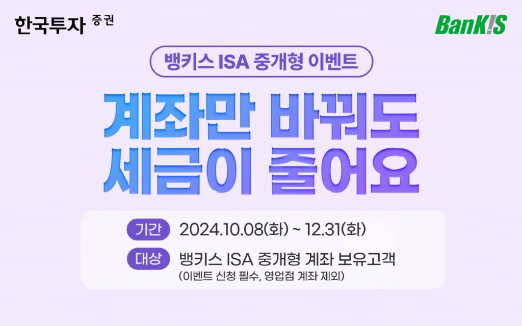 한국투자증권은 오는 12월 말까지 뱅키스 고객을 대상으로 중개형 ISA(개인종합자산관리계좌) 이벤트를 진행한다고 10일 밝혔다. 뱅키스는 비대면 또는 시중은행을 통해 개설하는 한국투자증권 온라인 전용 계좌 및 거래 서비스다.