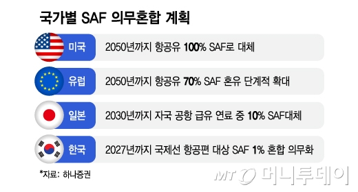 실제로 유럽 각국은 출국 항공편에 1~2%의 SAF 혼합을 의무화 하는 방안을 지난 2022년부터 시행 및 확대하고 있다. 궁극적으로 유럽연합(EU)는 2050년 SAF 혼합 비율을 70%까지 단계적으로 확대할 계획이다. 미국은 2050년까지 항공유 100%를 SAF로 대체한다는 방침이다. 우리나라도 2027년부터 국제선 항공편을 대상으로 SAF를 1% 혼합 하는 것이 의무다. 전세계적으로 필요한 SAF 수요도 2030년이 되면 거의 2000만톤에 육박할 것으로 추산된다.