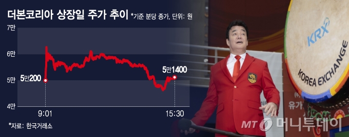 6일 코스피 시장에서 더본코리아(21,150원 ▲100 +0.48%)는 공모가(3만4000원)보다 1만7400원(51.18%) 오른 5만1400원에 거래를 마무리했다. 이날 4만6350원으로 시작했다. 장 중 6만4500원까지 상승 폭을 키웠으나 일부 반납했다. 종가 기준 시가총액은 7436억원을 기록했다.