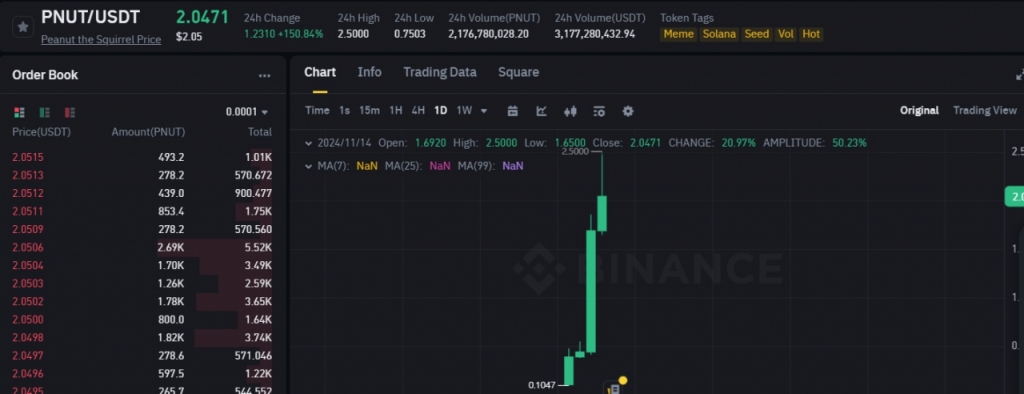 13일 오후 12시30분 해외 가상자산거래소 바이낸스에서 '피넛 더 스쿼럴(다람쥐 피넛)'이라는 이름의 가상자산(이하 PNUT)이 24시간 전보다 150.84% 급등한 2.04달러에 거래됐다. 지난 11일 신규 상장 당시 0.1047달러 선에서 약 20배 폭등한 것이다. 밈코인이란 특별한 실용적 목적 없이 재미로 만들어지는 코인을 뜻하는데 PNUT은 머스크 CEO가 X(옛 트위터)에서 "다람쥐와 밈코인(memecoin)이 미국을 구했다"고 적고, 땅콩 모양 이모티콘을 남기면서 매수세가 크게 쏠렸다. 피넛은 미국 뉴욕주 환경 당국이 고아 다람쥐를 구조해 7년간 키운 남성으로부터 다람쥐를 압수해 안락사시킨 다람쥐의 이름이기도 하다. 머스크 CEO는 미국 대선 기간에 이런 소식이 전해지자 X에 "정부가 도를 넘어 다람쥐를 납치하고 처형했다"고 쓰고 "트럼프 대통령이 다람쥐들을 구할 것"이라고 적기도 했다.