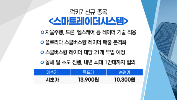 ▶ 럭키7 신규 종목 [스마트레이더시스템(6,750원 ▲90 +1.35%)]